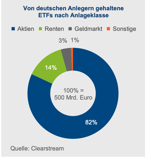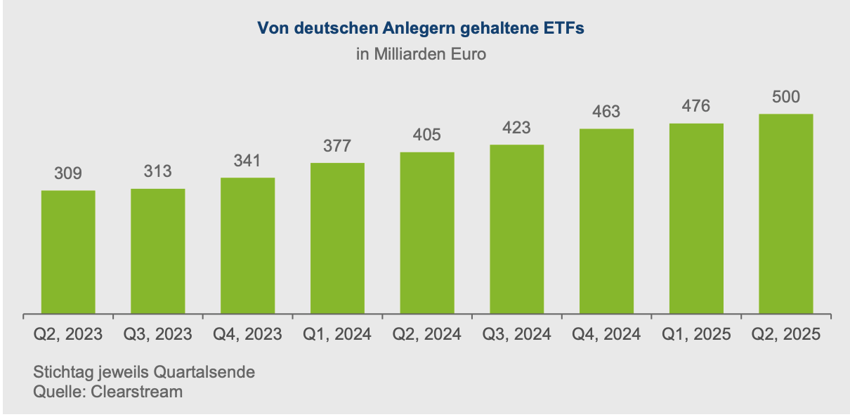 In den vergangenen zwei Jahren ist der deutsche Markt für börsengehandelte Fonds (ETFs) demnach stark gewachsen. Zwischen Juni 2023 und Juni 2025 stieg das für deutsche Anleger verwaltete Vermögen von 309 auf 500 Mrd. Euro. Das entspricht einer Steigerung von 62 %. Zum Vergleich: Der Vermögenszuwachs bei anderen offenen Publikumsfonds erreichte im selben Zeitraum lediglich 13 %.